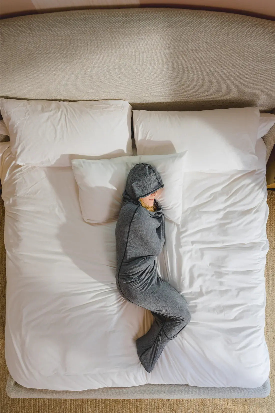 L’enveloppement est léger et élastique, pas une contention. Testez-le 5 minutes en journée pour apprivoiser la sensation ; vous restez libre de bouger et de dégager vos bras/jambes à tout moment.